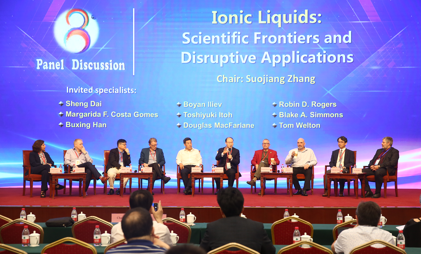 Panel discussion attended by Sheng Dai, Margarida Costa Gomes, Buxing Han, Boyan Iliev, Toshiyuki Itoh, Douglas MacFarlane, Robin D. Rogers, Blake A. Simmons, Tom Welton (Photo by IPE)