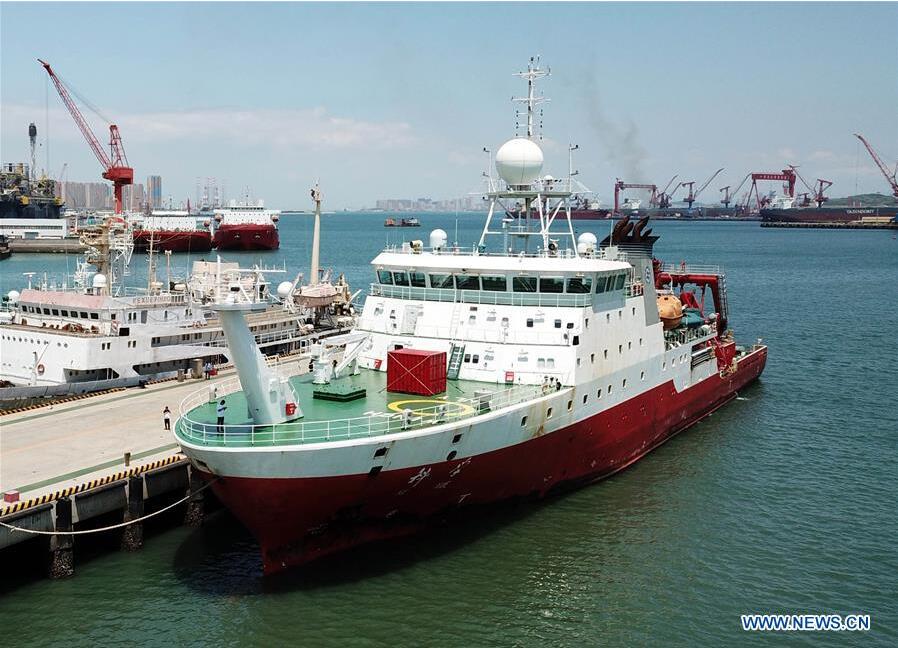 Chinese research vessel Science waits to depart from the city of Qingdao, east China's Shandong Province, May 18, 2019. Chinese research vessel Science left the eastern city of Qingdao Saturday, on an expedition to the little-known seamounts in the Mariana Trench, the world's deepest natural trench. Researchers will study the topography, hydrology and bioecology of the western Pacific Ocean's typical seamount, said Xu Kuidong, chief scientist of the mission with the Institute of Oceanology of the Chinese Academy of Sciences. (Xinhua/Li Ziheng)