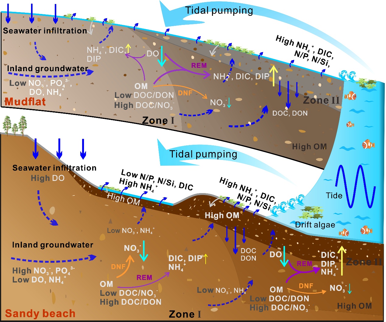 Results reveal distinct spatial distribution differences in nutrients and carbon within the groundwater between the fine-grained and coarse-grained layers in both sandy and muddy beaches. In sandy beaches, groundwater chemistry shifts from NO3--dominated in deep coarse-grained sediments (attenuated via denitrification) to NH4+-dominated in surface fine-grained sediments (primarily from organic matter mineralization). In muddy beaches, fine-grained sediments also accumulated high concentrations of NH4+, PO43-, and dissolved silicon. Integrating cluster analysis, Mantel analysis, end-member mixing models, and isotope tracing (δ15N-NO3- and δ18O-NO3-), the study shows these patterns arise from synergistic regulation by hydrological dynamics and biogeochemical reactions.