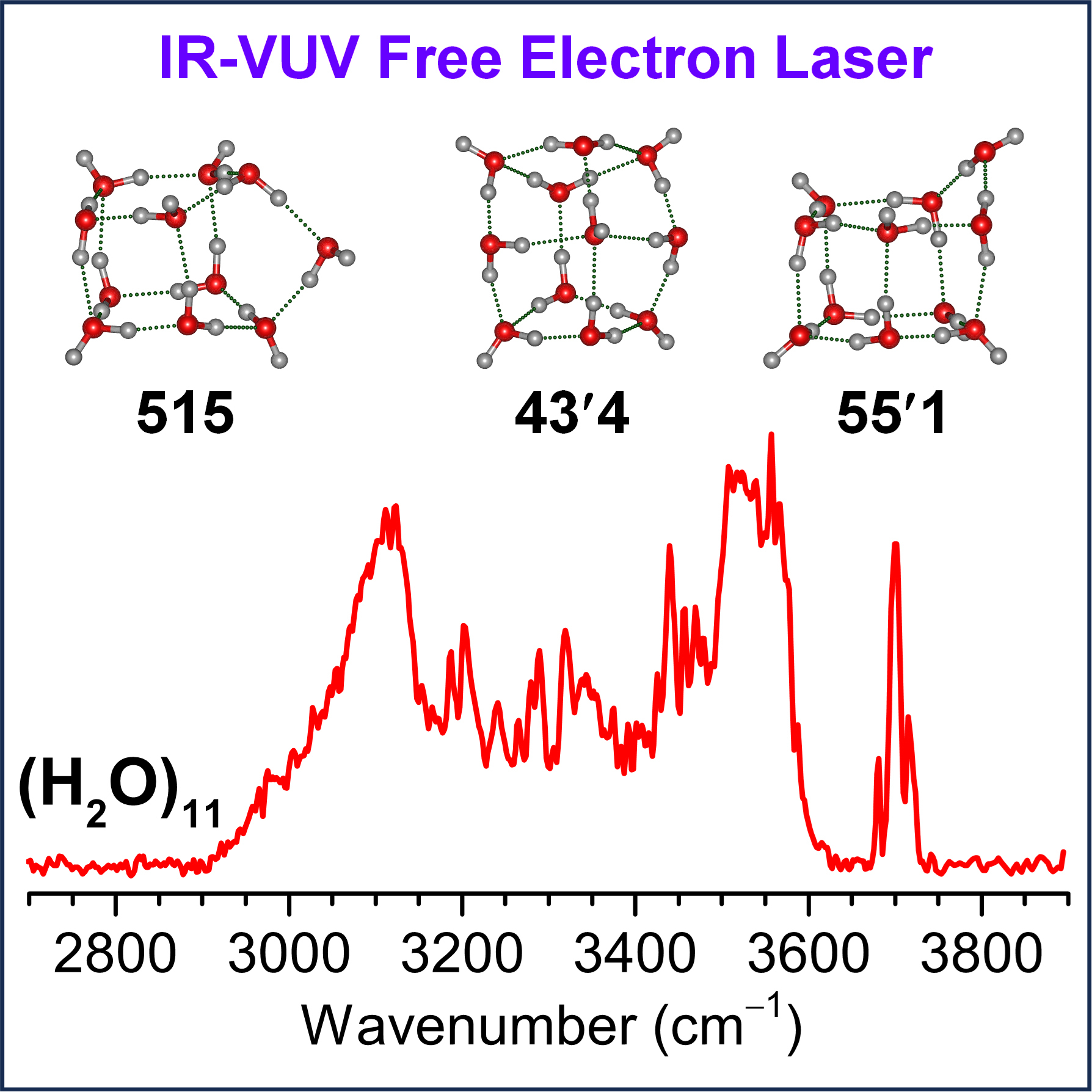 Experimental IR spectrum and the identified structures of water undecamer cluster (H2O)11. (Image by WANG Tiantong)