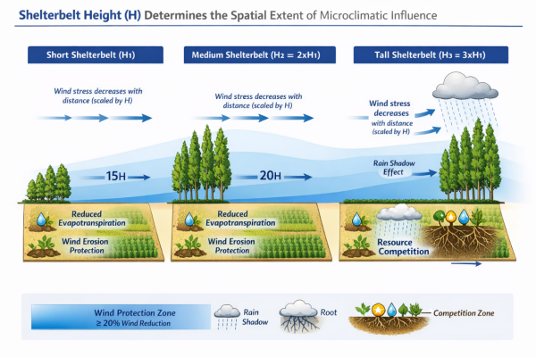 Shelterbelt height determines the spatial extent of microclimatic influence. (Image by XIEG)