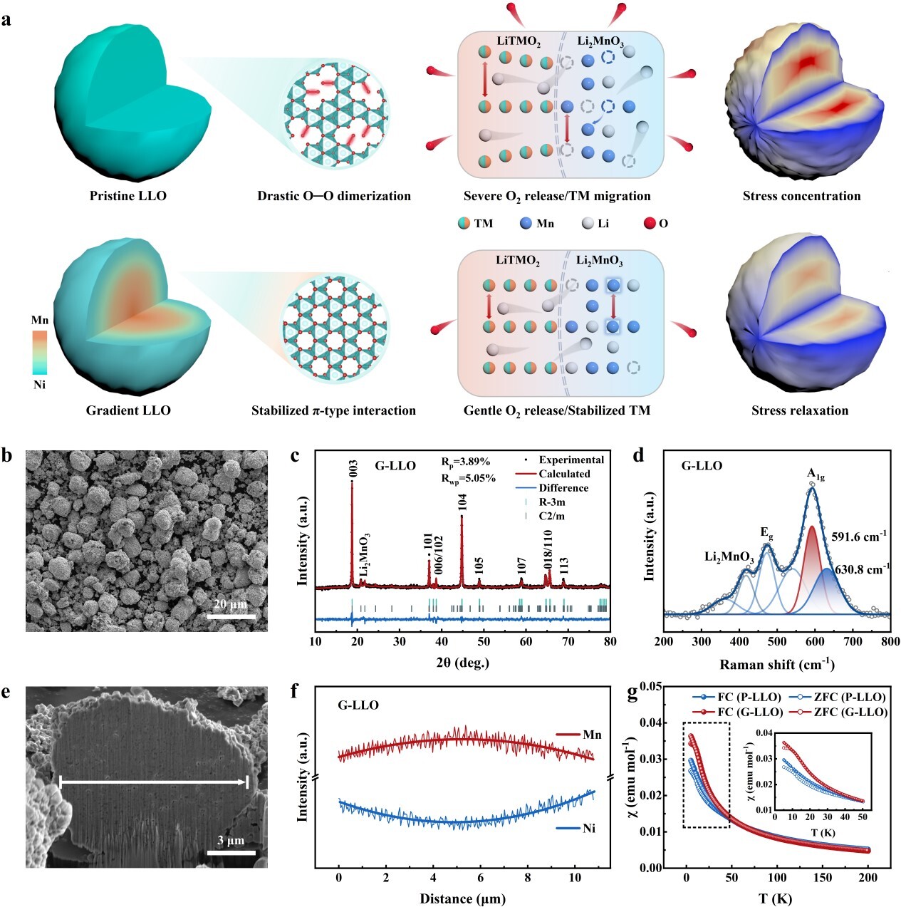A research team led by Prof. ZHAO Bangchuan from the Hefei Institutes of Physical Science of the Chinese Academy of Sciences, in collaboration with Prof. XIAO Yao from Wenzhou University, developed a composition gradient strategy to precisely regulate the internal stress distribution and electronic structure of Li-rich Mn-based cathode materials.