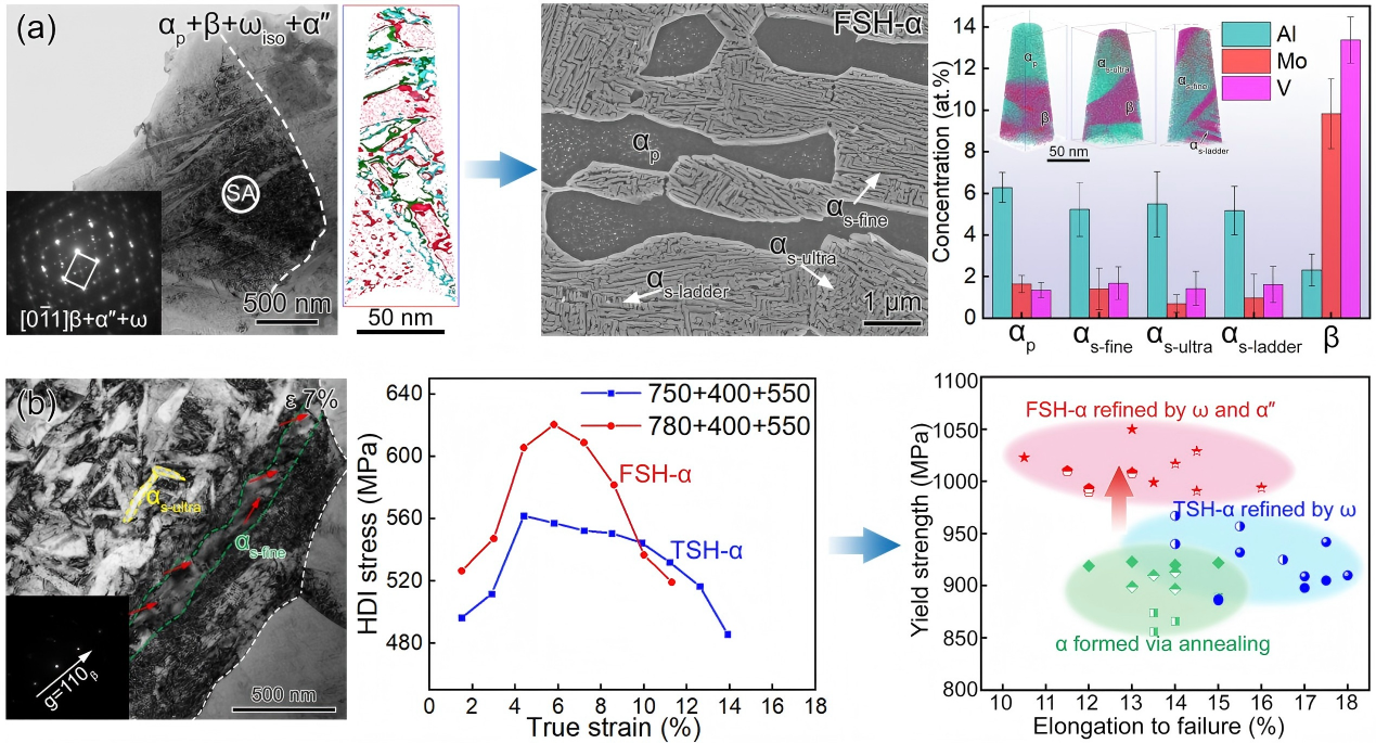 Fabrication strategy and mechanical behavior of the four-scale heterogeneous α (FSH-α) microstructure: (a) FSH-α fabricated by synergistically activating ω/α″ regulation pathways; (b) Multi-tiered network of hetero-interface promoting synergistic enhancement of strength and ductility. (Image by IMR)