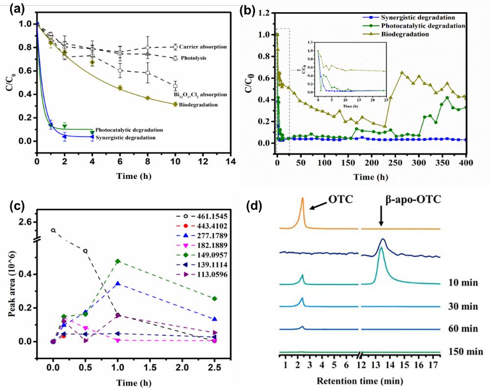 The degradation performance of the synergistic function to OTC in (a) static system and (b) dynamic system; The relative intensity evolution of (c) the main degradation byproducts and (d) β-apo-oxytetracycline. (Image by ZHAO Feng)