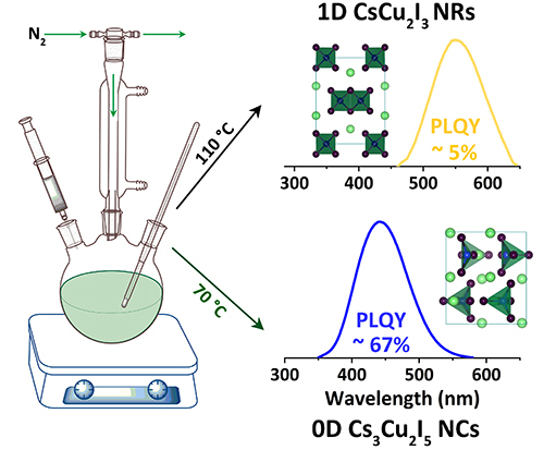 The scientists reported the colloidal synthesis of all-inorganic low-dimensional cesium copper halide nanocrystals (NCs) by adopting a hot-injection approach. Using the same reactants and ligands, but at different reaction temperatures, both 1D CsCu2I3 nanorods (NRs) and 0D Cs3Cu2I5 NCs could be prepared.