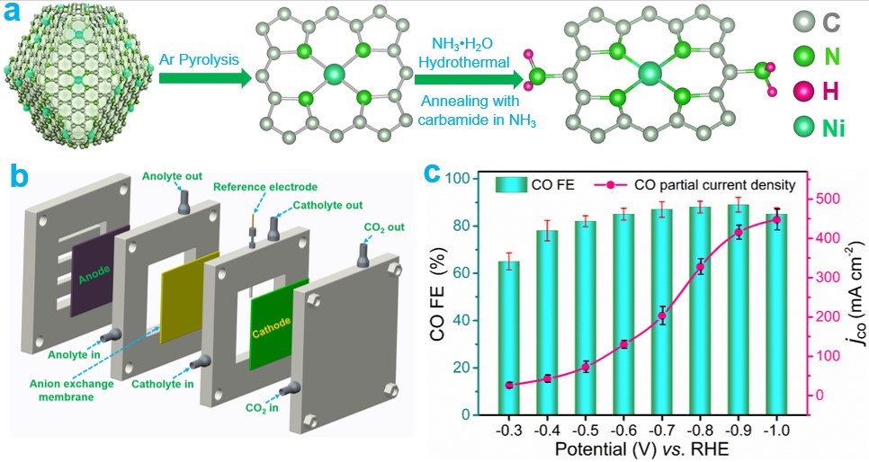 The aminated single-atom catalyst with remarkable CO2 reduction activity in a gas-fed electrolytic cell. (a) Schematic of the synthesis process for Ni-N4/C-NH2, (b) Schematic of a gas-fed flow cell configuration, (c) electrocatalytic activity of Ni-N4/C-NH2 in flow cell. (Image by CHEN Zhipeng)
