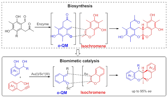 The researchers designed a highly efficient Au(I)/chiral Sc(III) bimetallic catalytic system by mimicking the biosynthetic pathway of polyketide oligomer natural products, and achieved asymmetric HDA reaction of in-situ generated isochromene and ortho-quinonemethide (o-QM).