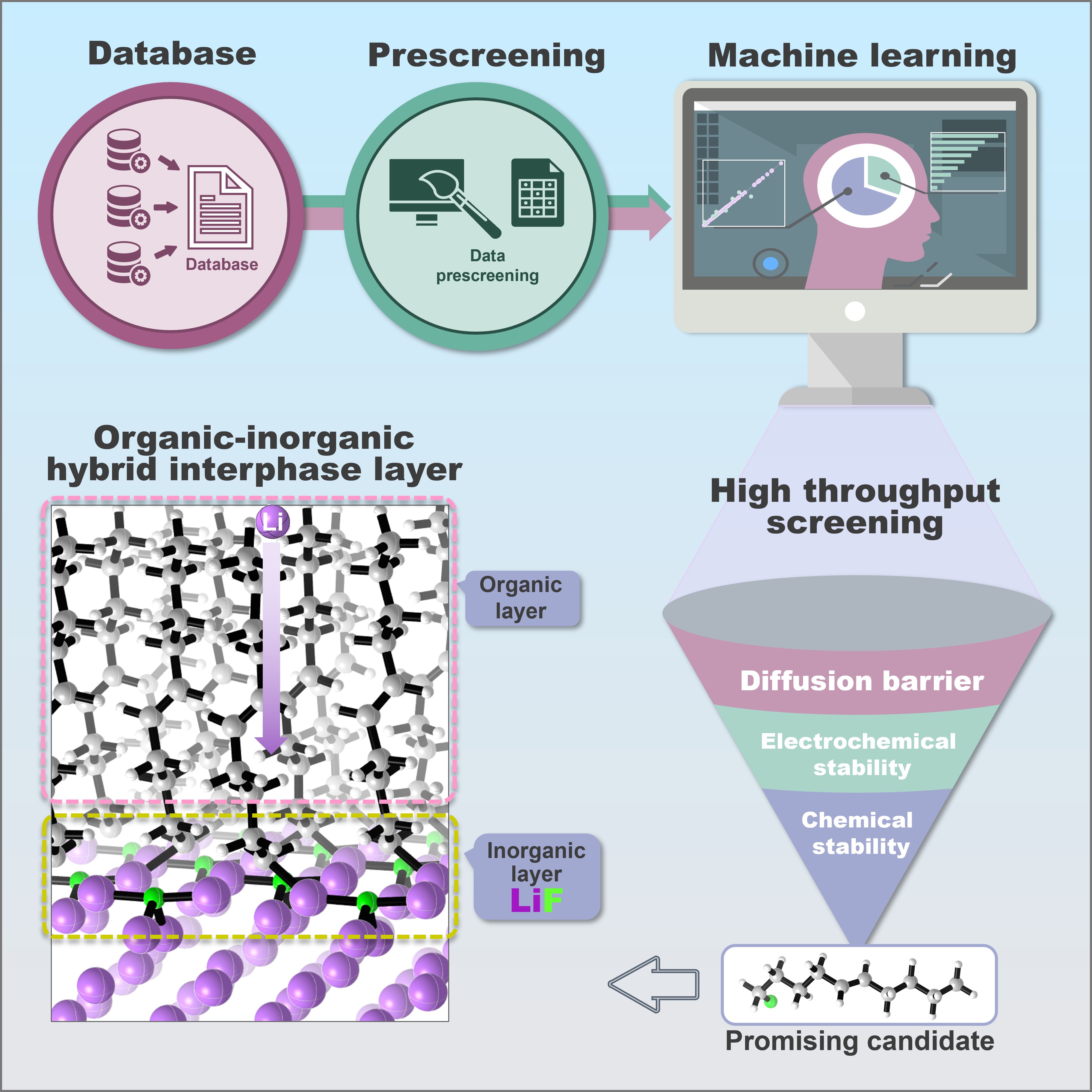 They established a database consisting of 128 self-assembled organic molecule candidates selected from the PubChem database and suggested eight best molecules to favor constructing the inorganic-organic hybrid interphase layer at Li metal anode. These molecules with terminated fluoride head group (-F) allow to form LiF inner inorganic interphase that improves the stability and ionic conductivity of the interphase layer on the Li metal anode, while the outer linear organic layer provides enriched 3D porous channels that facilitate Li diffusion and guide Li uniform deposition and suppress Li dendrite growth.