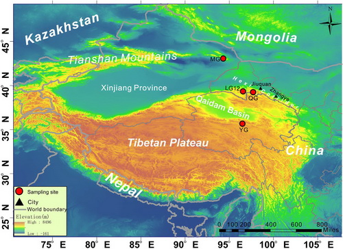 Map showing the study areas and sampling sites in the northeastern Tibetan Plateau, including the QG (Qiyi Glacier), LG12 (Laohugou Glacier No. 12), YG (Yuzhufeng Glacier), and MG (Miaoergou Glacier). (Image by KANG Shichang)