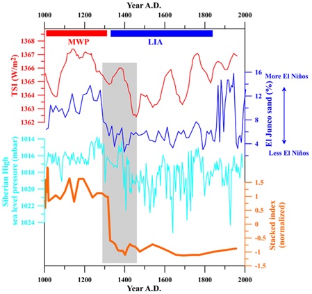 This may have primarily but nonlinearly been a response to the reduction in solar irradiance and its associated changes in atmospheric circulation (e.g., El Nino–Southern Oscillation and Siberian High).
