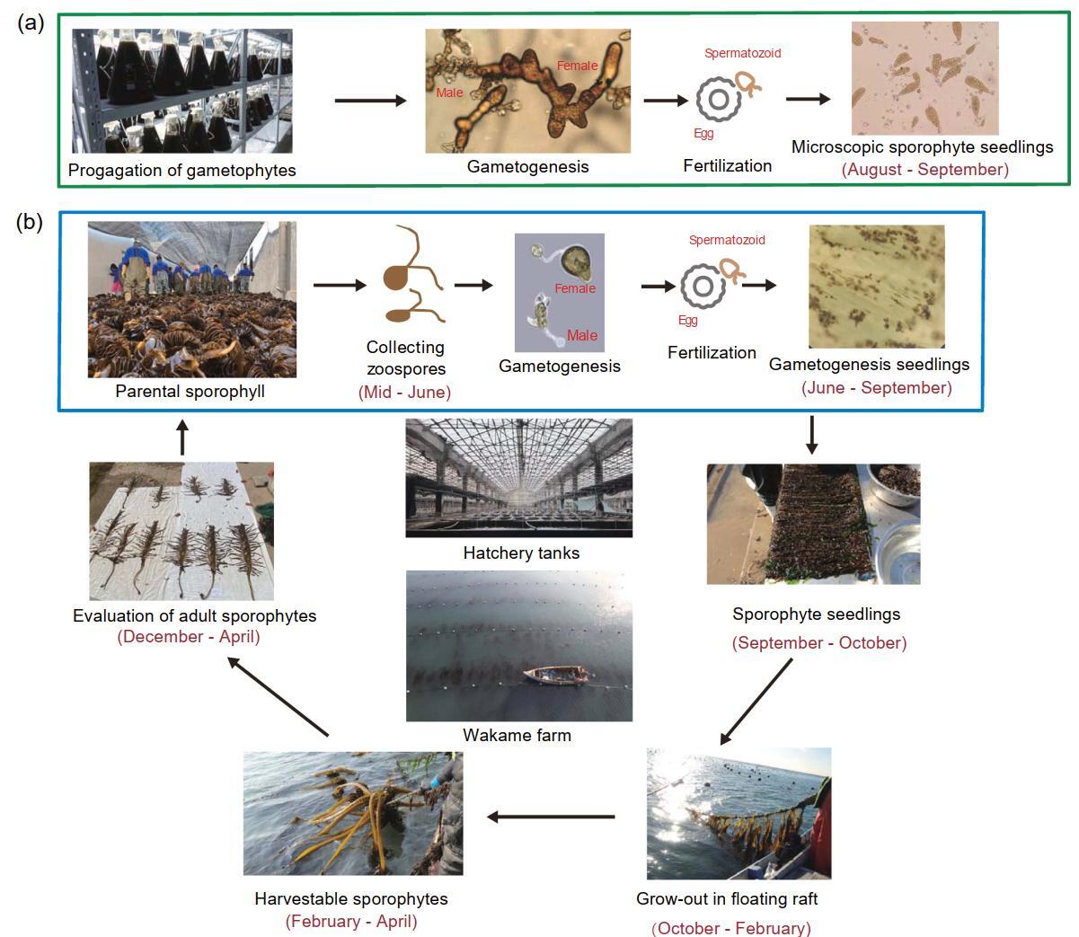 Full stage-covered U. pinnatifida seeldings and cultivation production cycle in north China. (a) Clonal hybrid breeding; (b) Traditional commercial cultivation sporophyte breeding. (Image by IOCAS)