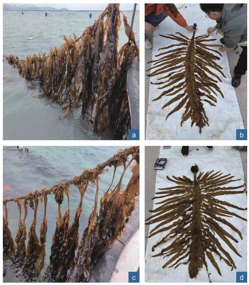 U. pinnatifida under different farming methods in Fujian. a, b, cluster-clipping; c, d, individual-clipping. (Image by IOCAS)