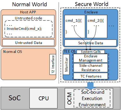 SecTEE only requires a small memory chip called on-chip memory (OCM), which is a common block in all chips. It implements a small kernel running on the OCM, and the kernel takes OCM as the only working memory and encrypts all the data/code outside the chip, i.e., DRAM, to prevent physical attacks.