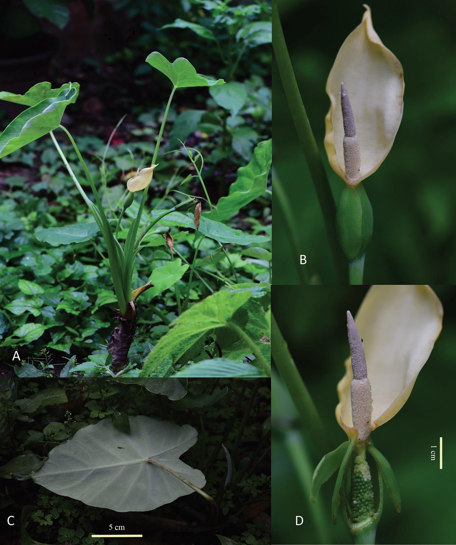 Colocasia kachinensis A. plant B. inflorescence C. lower surface of leaf D. spadix. (Image by ZHOU Shishun)