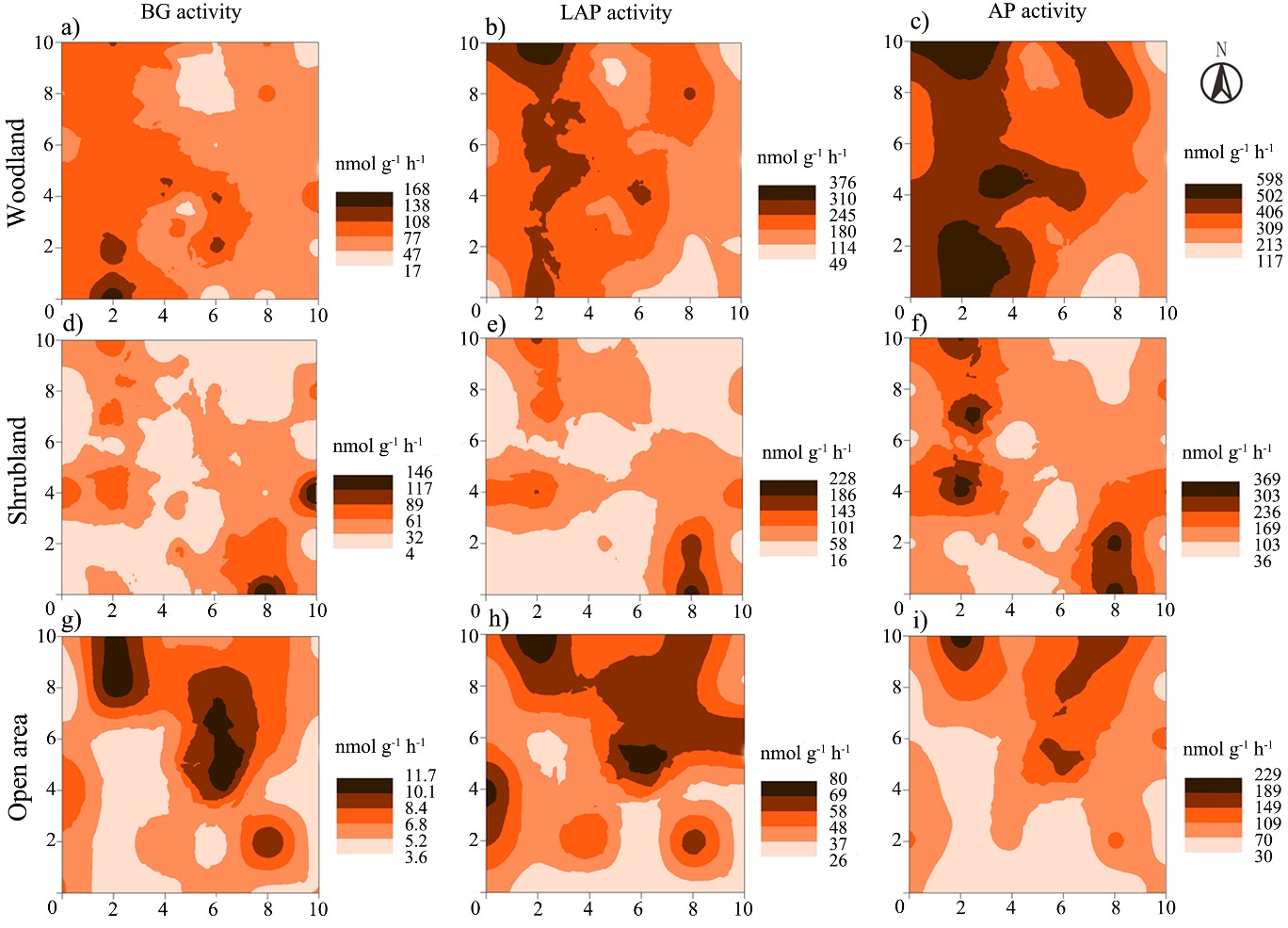 Spatial patterns of activities of BG, LAP and AP at the plot scale in each site (Image by LI Qianxi)