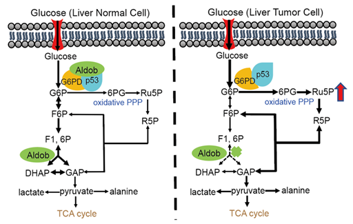 A multivariate analysis demonstrated that Aldob is an independent risk factor for HCC. Using N-Nitrosodiethylamine (DEN)-induced HCC mouse model, the researchers found that global or liver specific knockout (KO) of Aldob promotes hepatocellular carcinogenesis through enhancing G6PD activity to increase the metabolic flux to PPP, while re-expression of Aldob in liver-specific Aldob KO mice suppresses HCC. Consistently, pharmacological inhibition or genetic knocking down G6PD attenuates the tumor formation. All these in vivo data suggested that Aldob opposes HCC through regulation of G6PD and PPP.