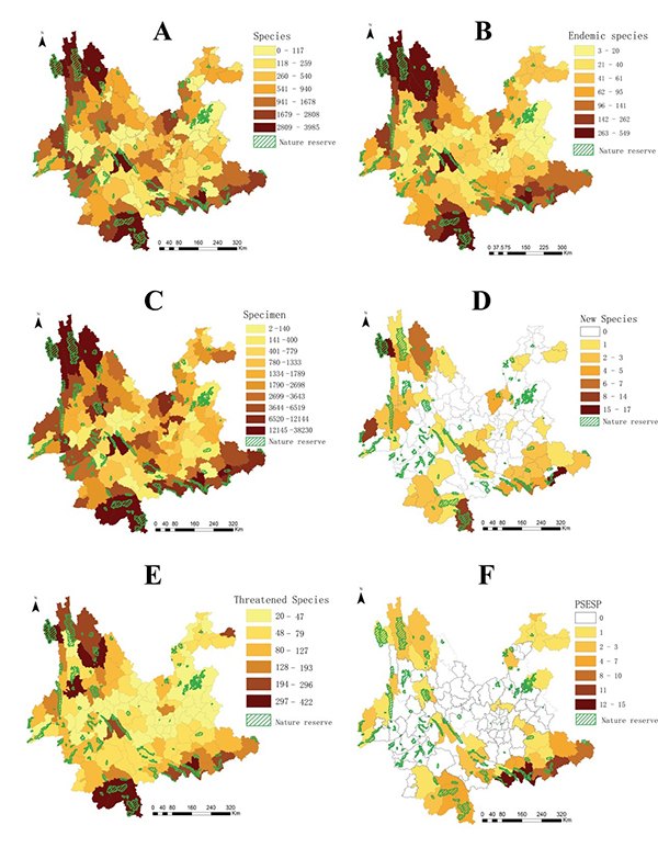 Fig.1: County-level distribution of plant diversity in Yunnan. (A) Total species distribution patterns. (B) Endemic species distribution patterns. (C) Specimen distribution patterns. (D) New species distribution patterns (from 2013 to 2019). (E) Threatened species distribution patterns. (F) Distribution patterns of Plant Species with Extremely Small Populations (PSESP). (Image by KIB)