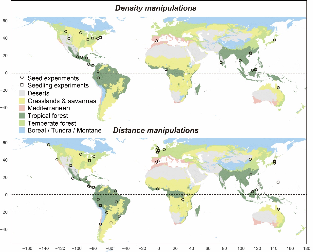 Geographical distribution of studies testing density-dependent and distance-dependent J-C effects included in this meta-analysis. Seed mortality experiments are plotted as unfilled circles, whereas seedling mortality experiments were plotted as filled squares. (Image by SONG Xiaoyang)