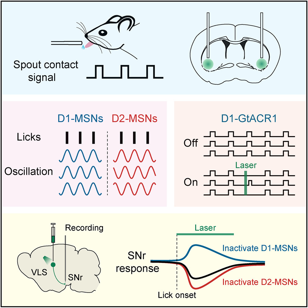 They found that, at timescale of a lick bout, inactivation of D1-MSNs reduced lick rate, whereas inactivation of D2-MSNs increased lick rate. Using optogenetic tagging, they found that D1- and D2-MSNs were both activated during licking movement, but had different activity during the initiation and execution of lick sequence.