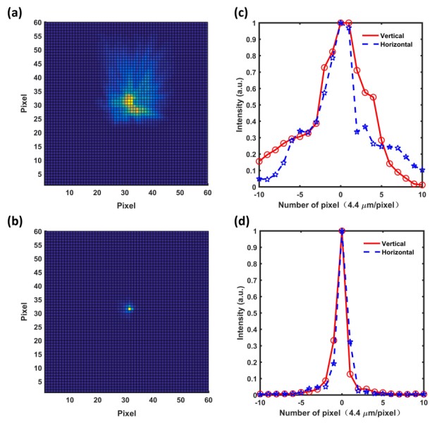 Fig. 2. Focal spot before and after applying the pre-compensator(Image by SIOM)