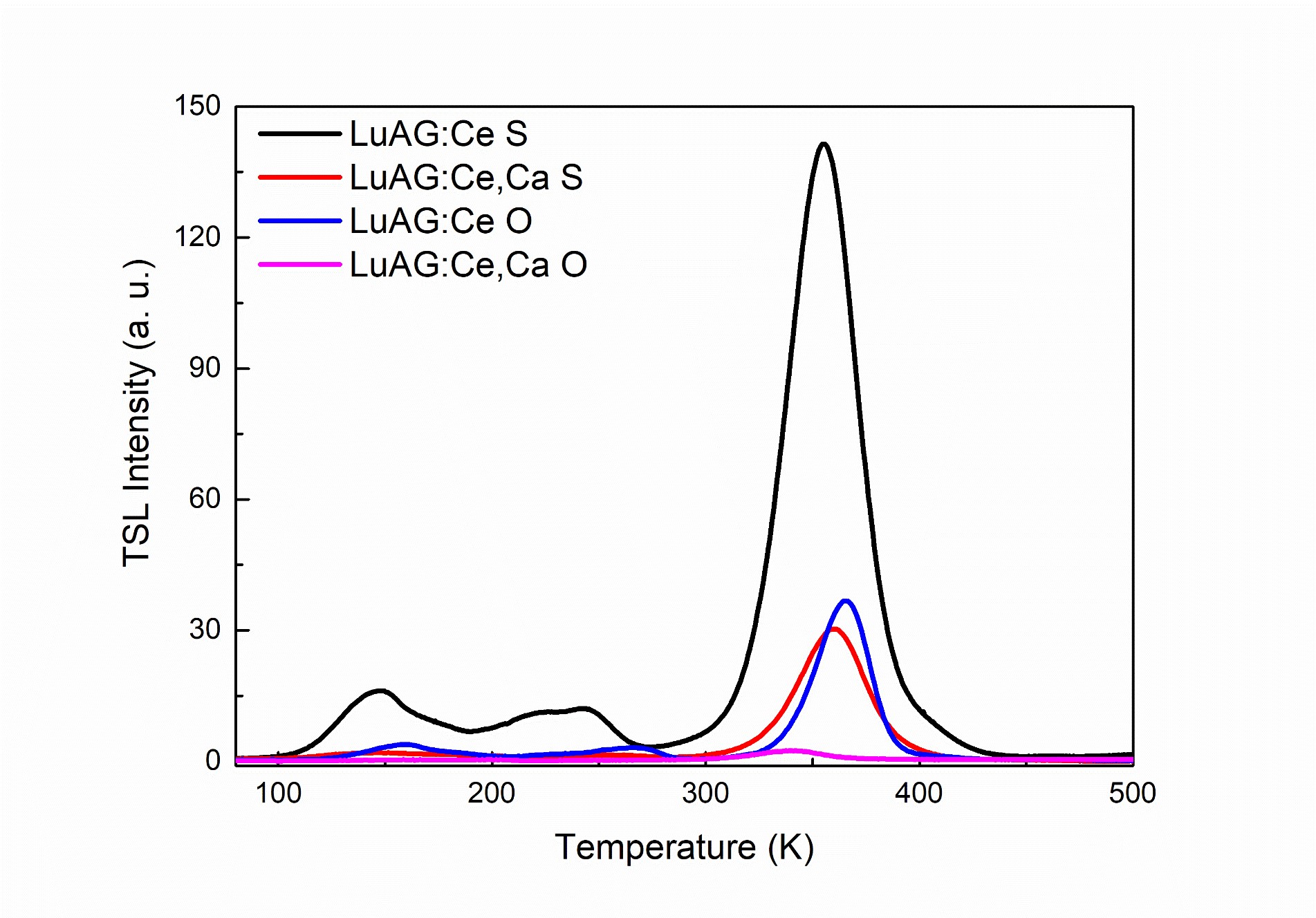 TSL curves of LuAG:Ce and LuAG:Ce,Ca ceramics before and after oxygen-annealing. (Image by SIOM)