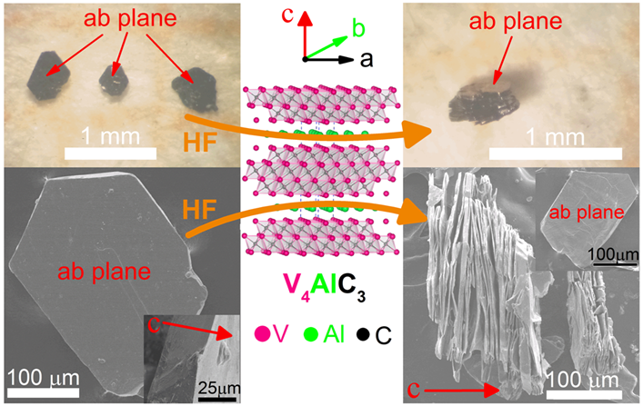 For this purpose, the researchers in ISSP firstly grew millimeter-scale V4AlC3 single crystals by high-temperature flux method. And then, V4AlC3 single crystals were immersed in hydrofluoric acid at room temperature for 40 days.