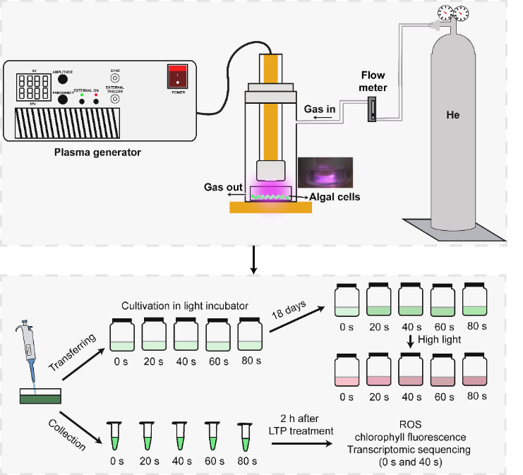 Schematic diagram of the DBD plasma set-up and the LTP treatment of H. pluvialis (Image by CHEN Zhu)