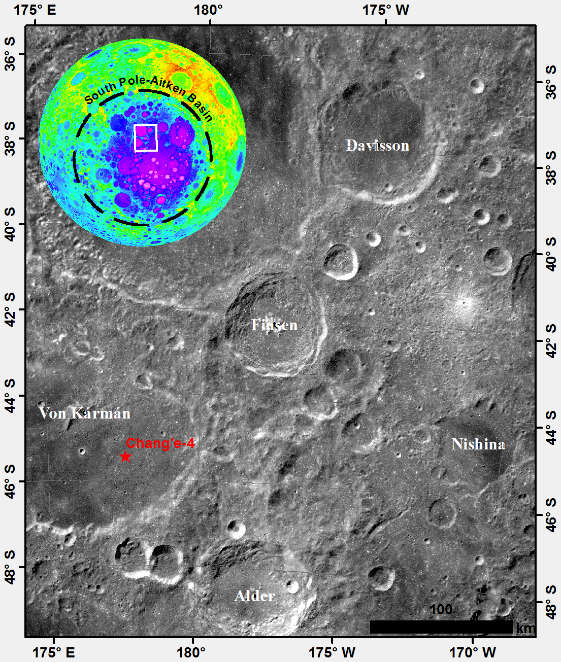 China's Chang'e-4 probe, including a lander and a rover, successfully touched down the floor of Von Kármán crater within the South Pole-Aitken (SPA) basin on the farside of the Moon on January 3, 2019. Since then, Chang'e-4 rover has been traversing on the floor of Von Kármán crater and has carried out a string of in situ measurements along traverse with equipped scientific payloads.