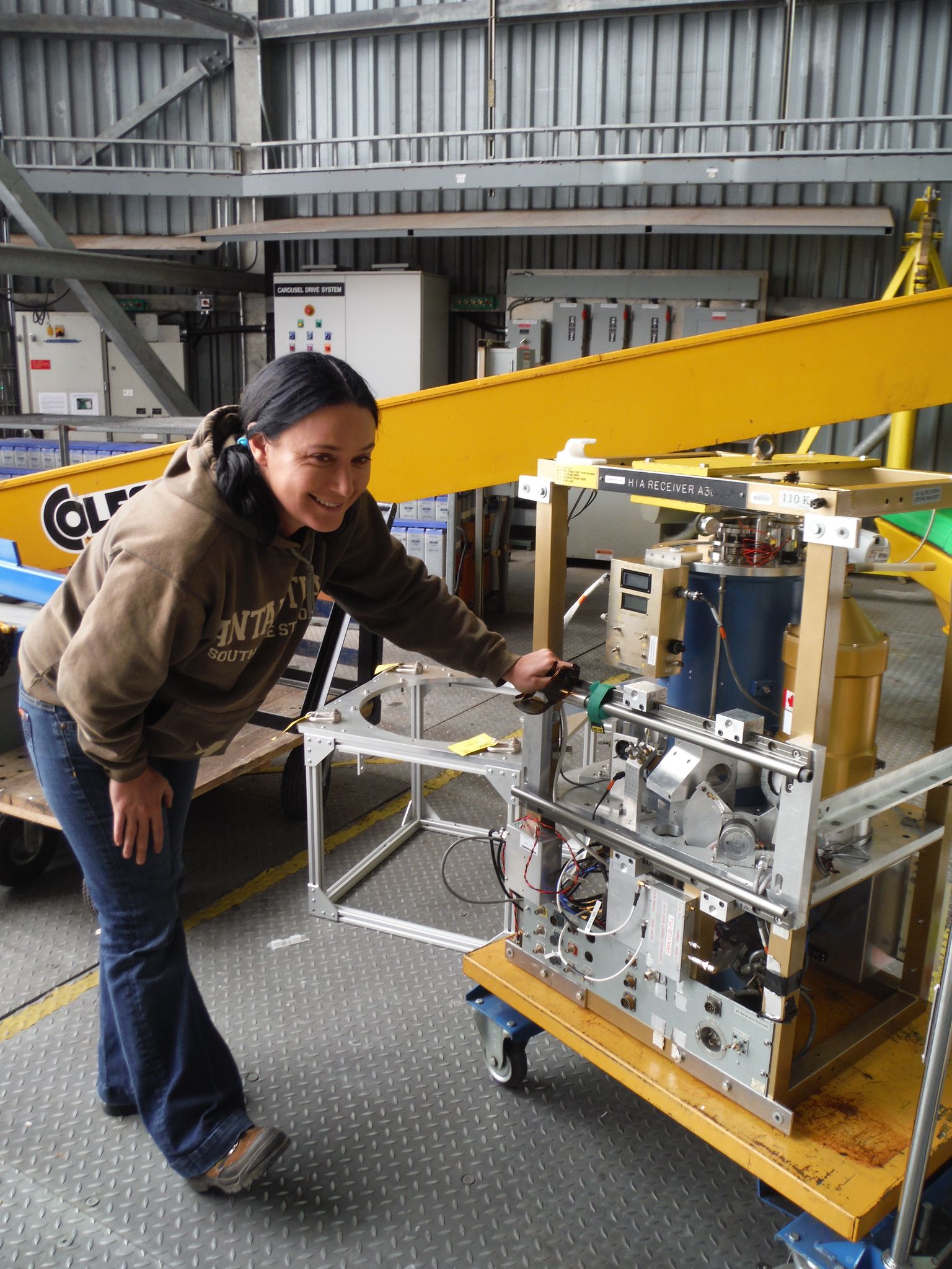 Fig.3 JCMT Deputy Director, Jessica Dempsey stands beside the now retired instrument, RxA3m, that made this first detection of phosphine on Venus. The instrument has since been replaced by a more powerful instrument called Nāmakanui, that is available to all EAO astronomers. (Image by Harriet Parsons)
