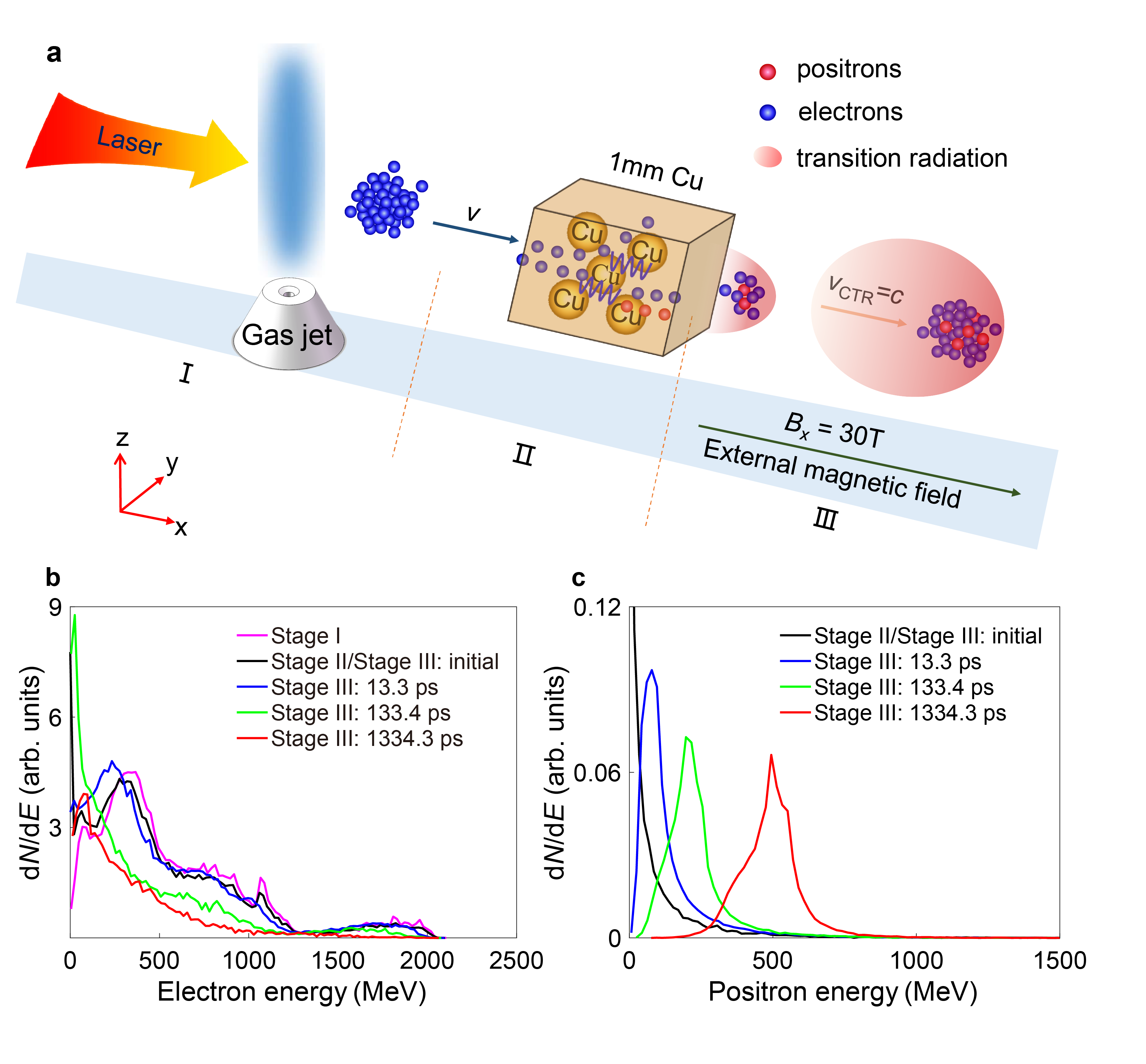a. Sketch of the proposed setup; b Electron energy spectra; c The energy spectra of positrons. (Image by SIOM)