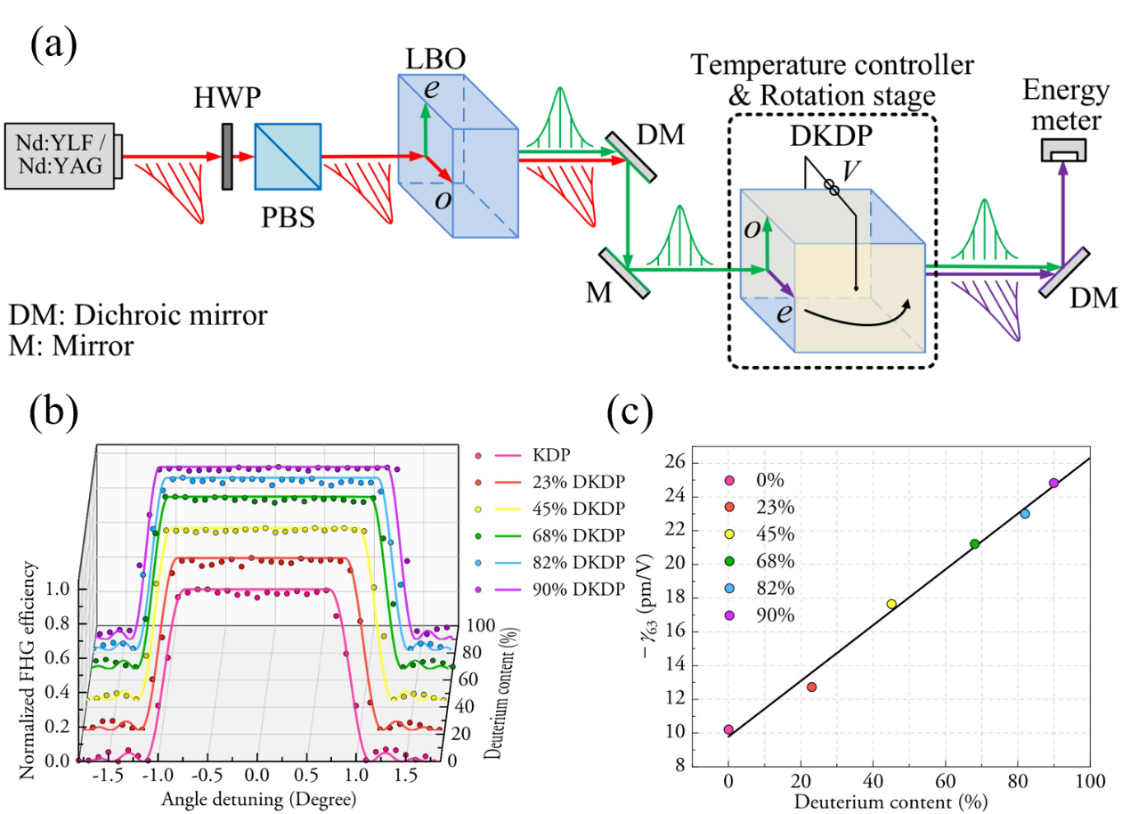 Fig.1 (a) experiment setup for measuring the linear EO coefficient of K(H1-xDx)2PO4 crystals; (b) FHG characteristics of different deuterium content DKDP crystals based on the VTPM; (c) Linear EO coefficients of K(H1-xDx)2PO4 crystals. (Image by SIOM)