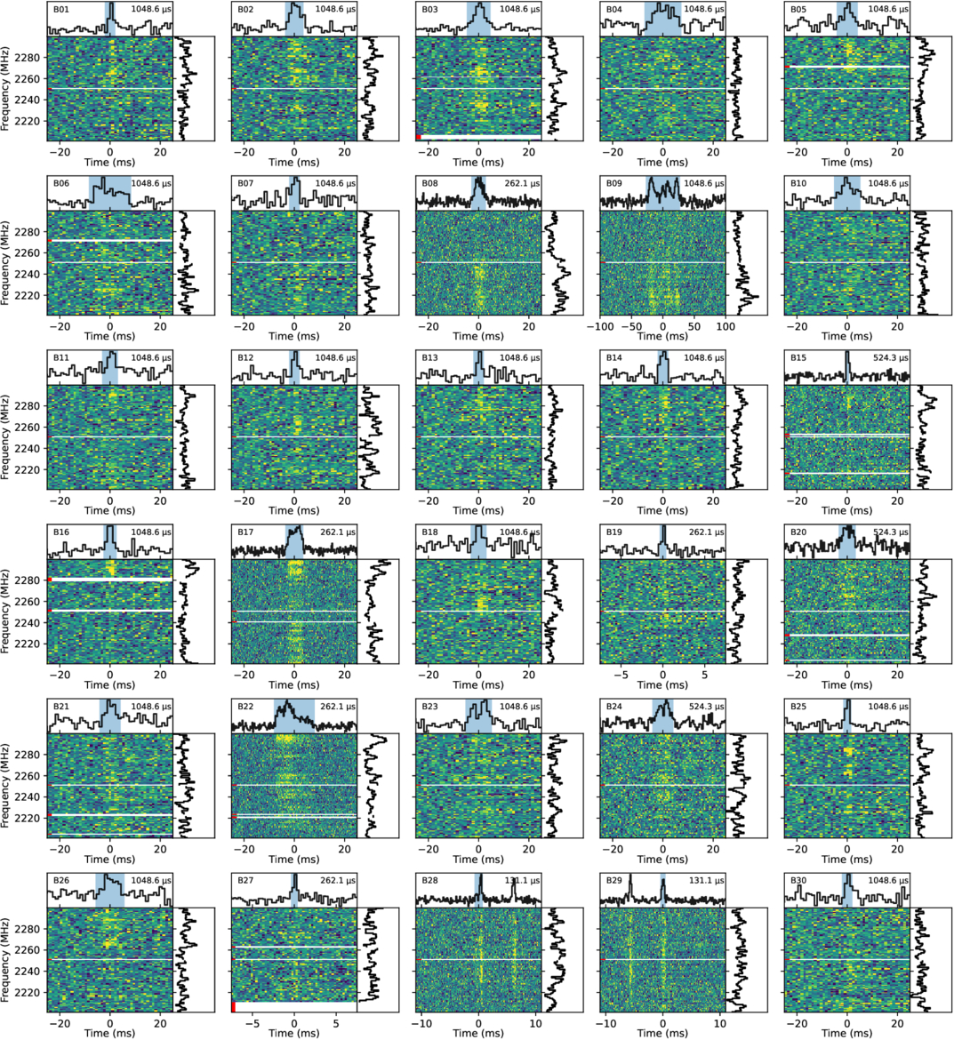 Representative bursts of FRB 20240114A detected by TMRT. In each subplot the dynamic spectrum is shown in the centre, with the time‑domain profile above and the frequency‑domain profile on the right. (Image by SHAO)