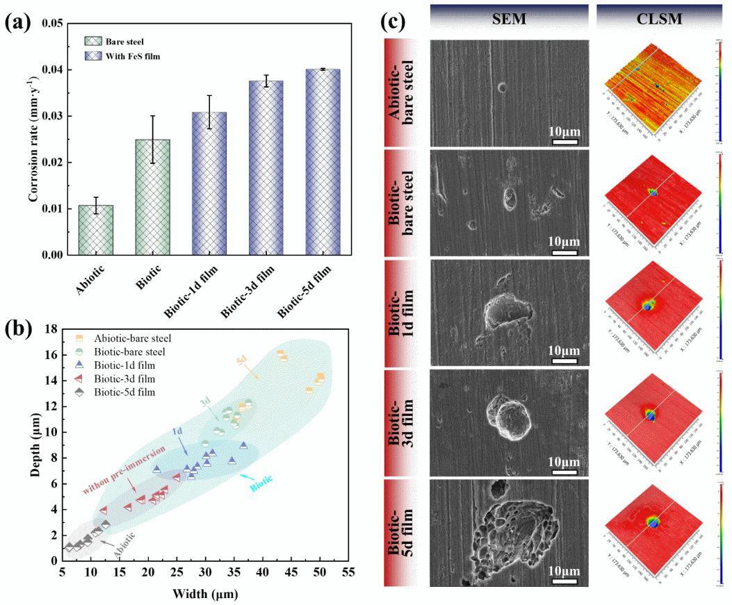 Microbial corrosion behavior of X80 steel: (a) corrosion rate; (b) statistical analysis of pit depth; (c) SEM morphology of the deepest pit and its corresponding 3D surface profile. (Image by IMR)
