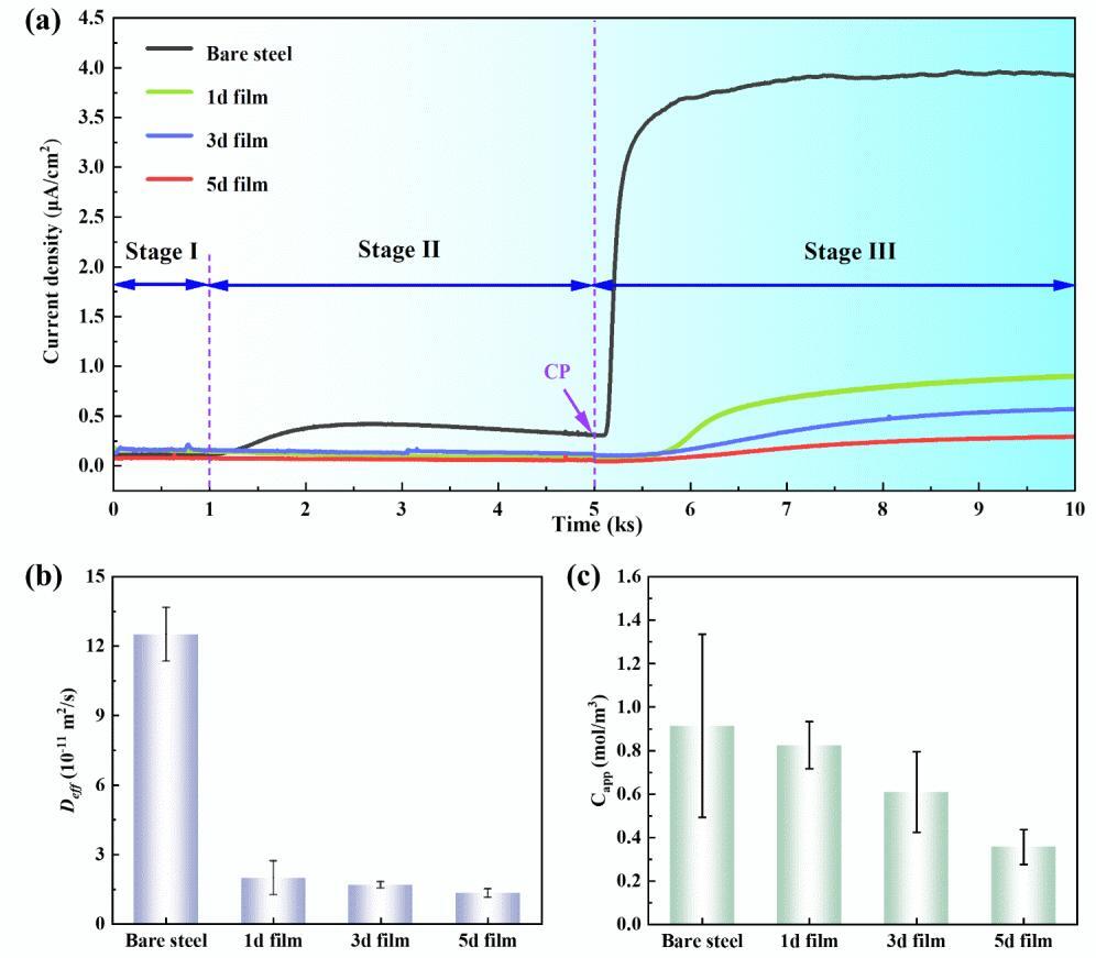 Hydrogen permeation behavior of X80 steel covered by microbiological corrosion product film: (a) hydrogen permeation current density–time curves under −1.1 V vs. SCE cathodic polarization; (b) effective hydrogen diffusion coefficient (D_eff); (c) apparent hydrogen concentration (C_app). (Image by IMR)