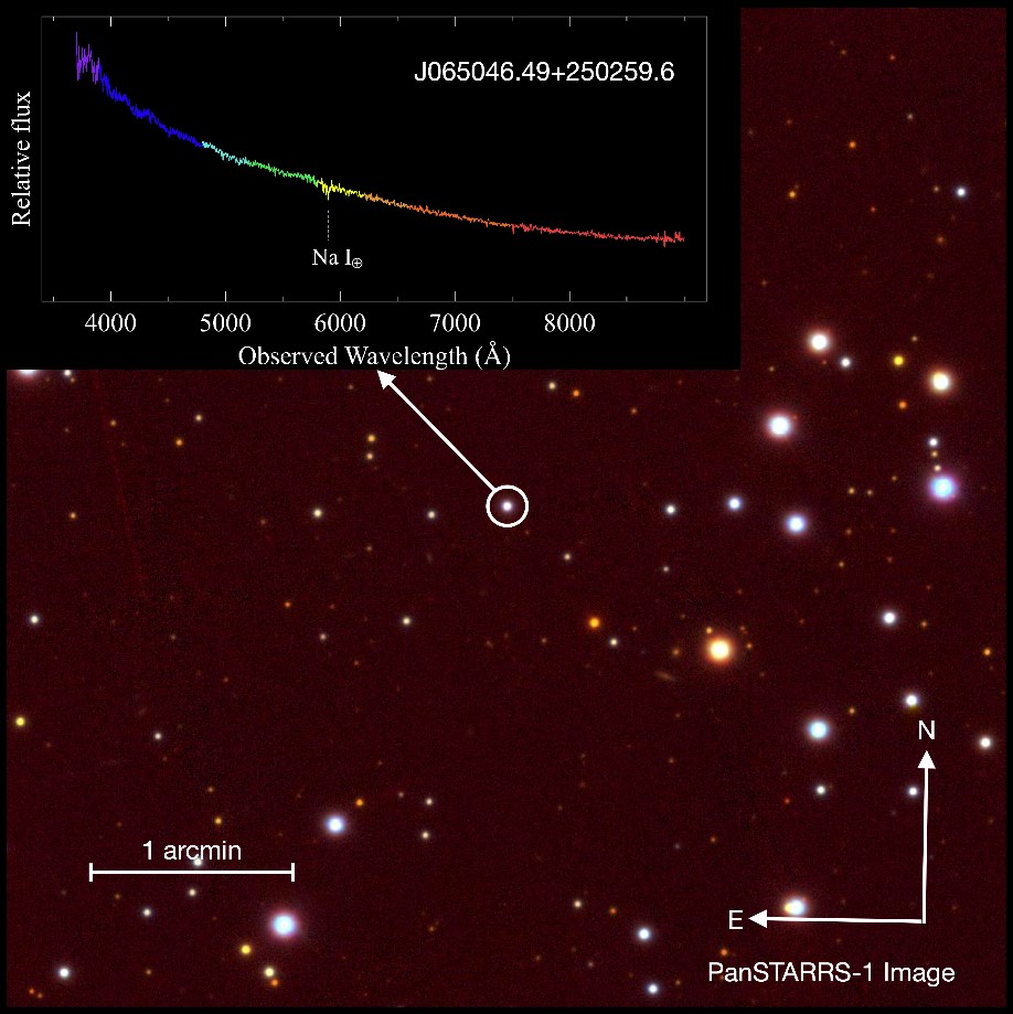 Fig. 2 Example of the completely featureless optical spectrum of the BL Lac known as J065046.49+250259.6. (Image by Harold A. Peña Herazo)