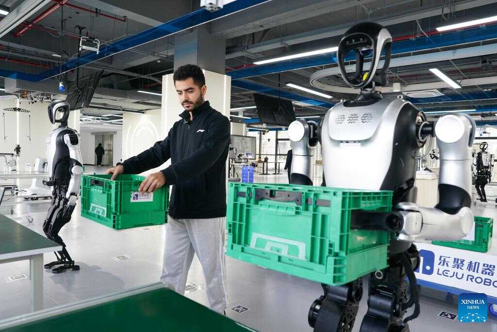 Ahmed Medhat Mostafa Elsayed carries goods with a robot at the pre-training venue for the Embodied Artificial Intelligence (EAI) robots data collection in Hefei, east China's Anhui Province, Nov. 28, 2025. (Xinhua/Du Yu)