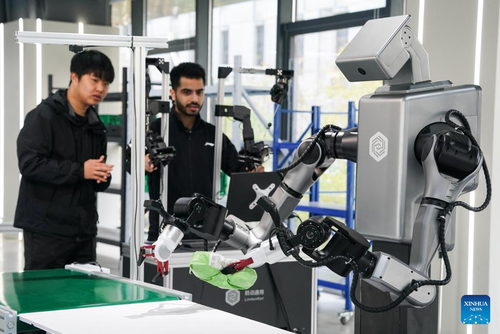 Ahmed Medhat Mostafa Elsayed (R) tries operating a parcel sorting robot at the pre-training venue for the Embodied Artificial Intelligence (EAI) robots data collection in Hefei, east China's Anhui Province, Nov. 28, 2025. (Xinhua/Du Yu)