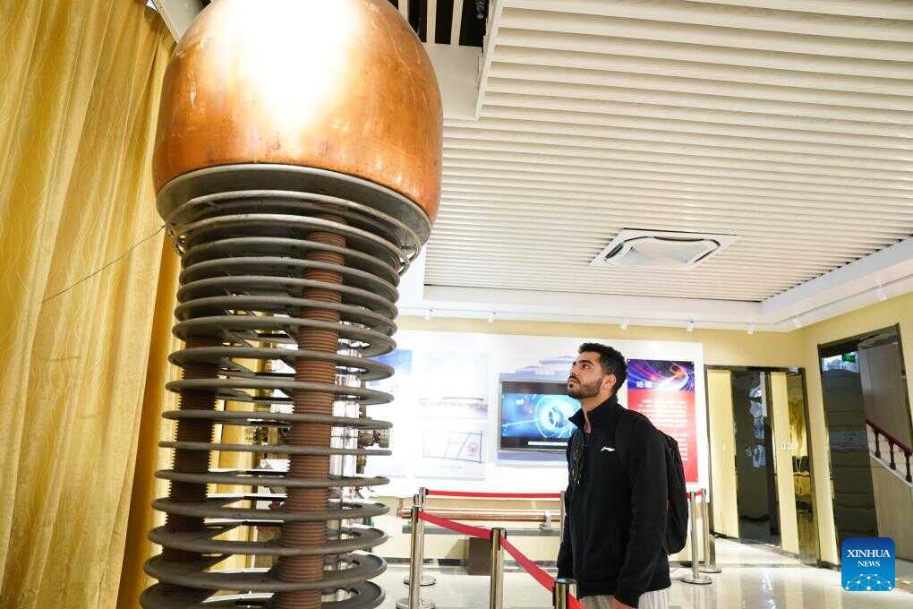 Ahmed Medhat Mostafa Elsayed looks at a model of a proton electrostatic accelerator at the history gallery of University of Science and Technology of China in Hefei, east China's Anhui Province, Nov. 28, 2025. (Xinhua/Du Yu)