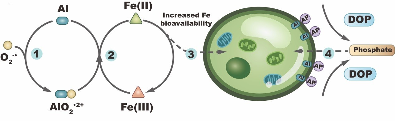 Fig. 1 Diagram of how aluminum may facilitate the uptake of iron and the utilization of dissolved organic phosphorus by marine phytoplankton (Image by ZHOU Linbin)