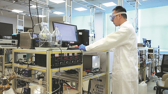 A researcher conducts carbon dioxide and carbon monoxide electrolysis tests at the Dalian Institute of Chemical Physics in Dalian, Liaoning province. CHINA DAILY
