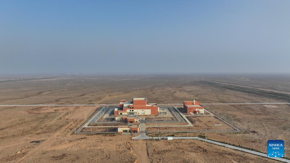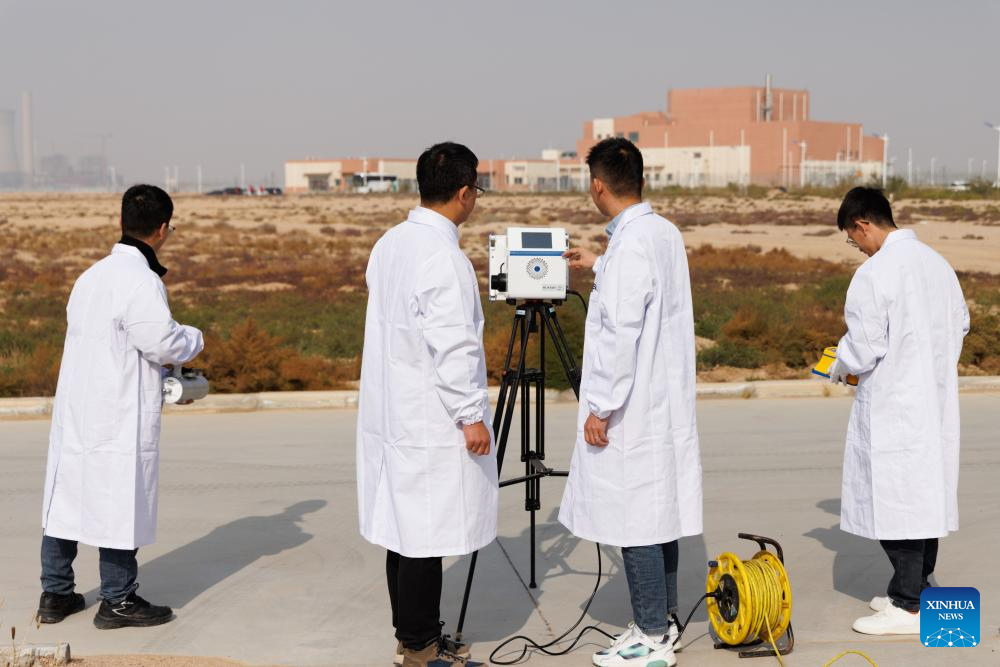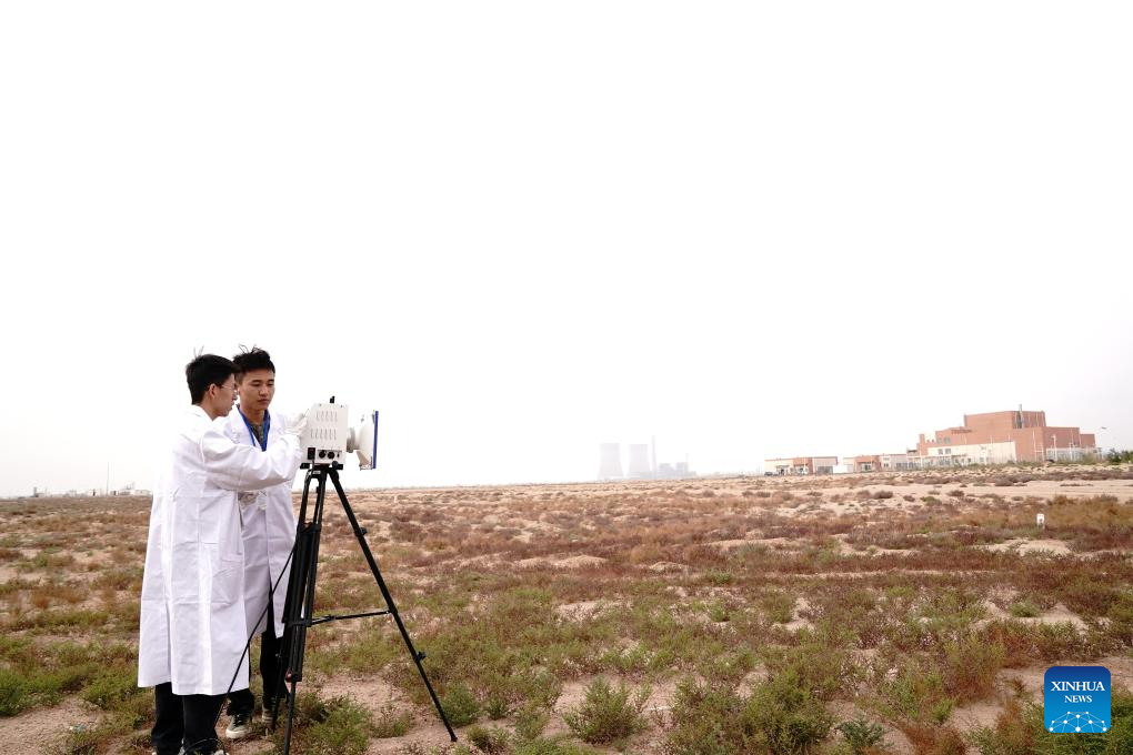 Researchers conduct environmental monitoring at the Wuwei campus of the Chinese Academy of Sciences' Shanghai Institute of Applied Physics (SINAP) in Minqin County of Wuwei City, northwest China's Gansu Province, Oct. 24, 2025. (Xinhua/Jin Liwang)