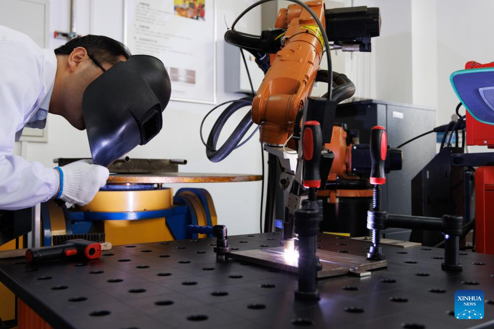 A researcher observes the welding progress of alloy materials used in building the Thorium Molten Salt Reactor, at a laboratory of Jiading campus of the Chinese Academy of Sciences' Shanghai Institute of Applied Physics (SINAP) in east China's Shanghai, Oct. 23, 2025. (Xinhua/Jin Liwang)