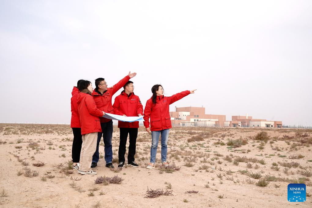 Staff members discuss follow-up constructions at the Wuwei campus of the Chinese Academy of Sciences' Shanghai Institute of Applied Physics (SINAP) in Minqin County of Wuwei City, northwest China's Gansu Province, Oct. 24, 2025. (Xinhua/Zhang Jiansong)
