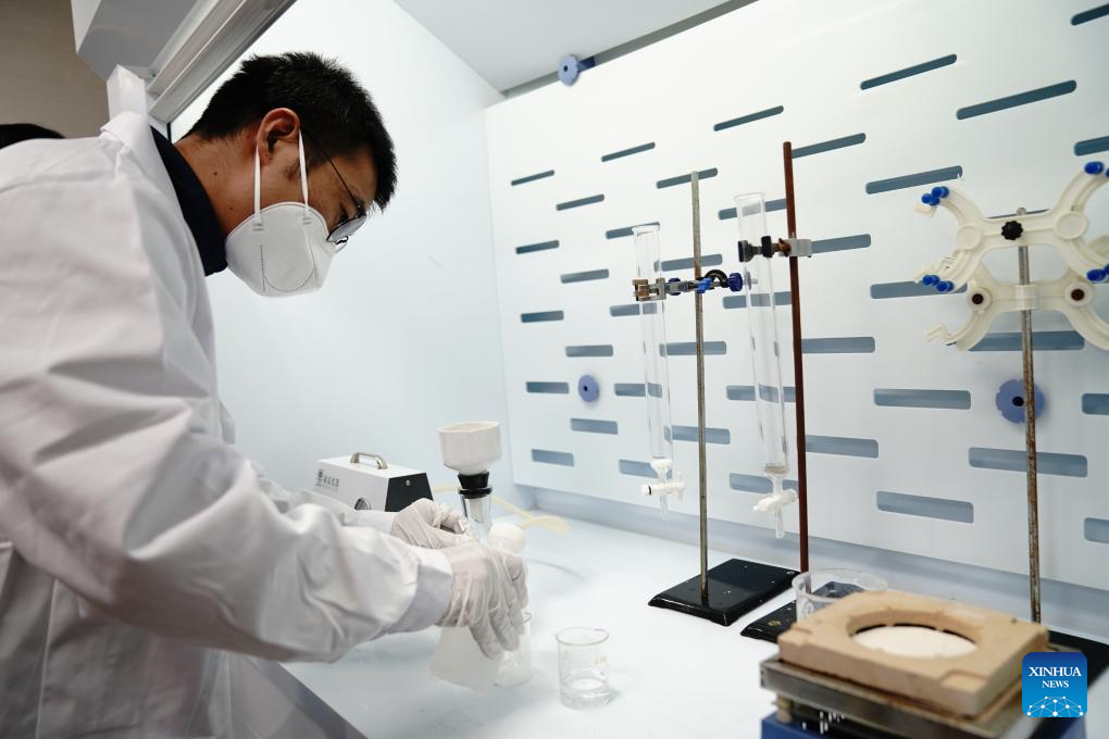 Researchers take out fuel salt samples at the Wuwei campus of the Chinese Academy of Sciences' Shanghai Institute of Applied Physics (SINAP) in Minqin County of Wuwei City, northwest China's Gansu Province, Oct. 24, 2025. (Xinhua/Zhang Jiansong)