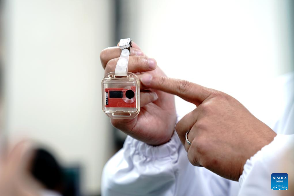 A staff member puts on a device which can measure the radiation level to ensure personal safety at the Wuwei campus of the Chinese Academy of Sciences' Shanghai Institute of Applied Physics (SINAP) in Minqin County of Wuwei City, northwest China's Gansu Province, Oct. 24, 2025. (Xinhua/Zhang Jiansong)