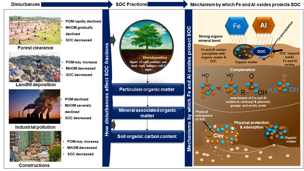 Impacts of anthropogenic disturbances on soil organic carbon fractions and the mechanisms by which iron and aluminum oxides stabilize SOC. (Image by LU Xiankai et al.)
