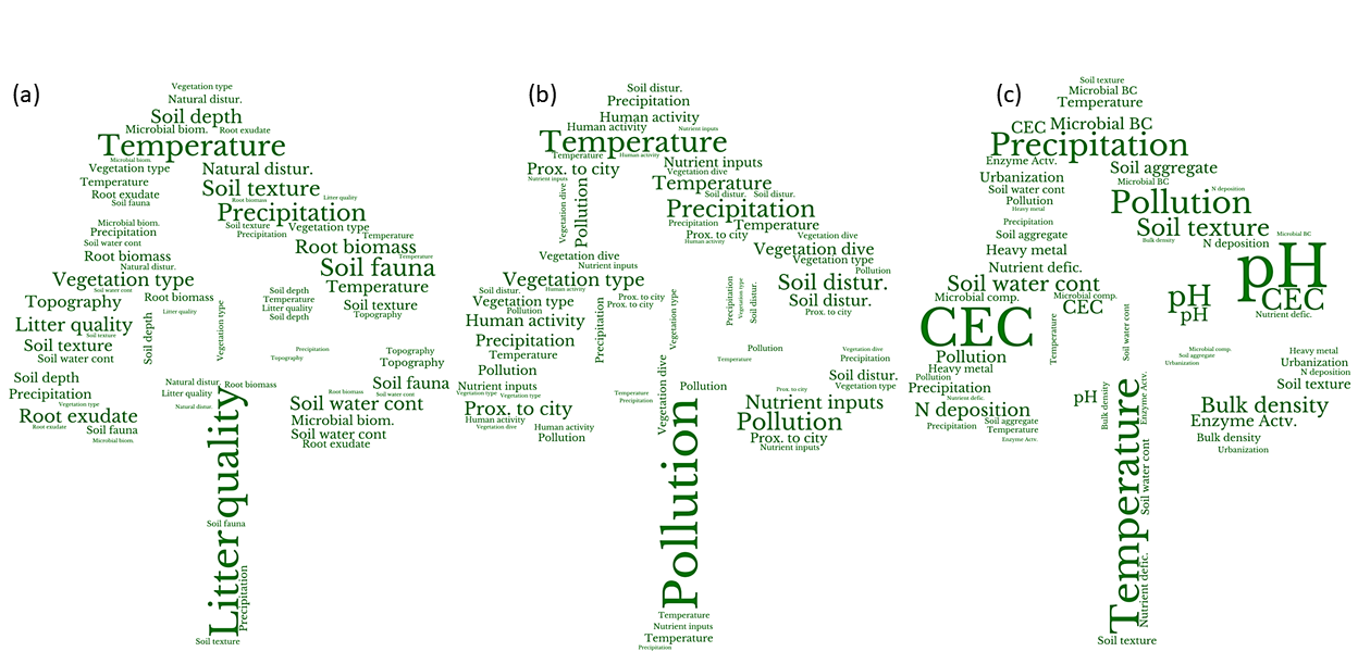 Influencing factors of SOC stability in rural forest (a), sub-urban forest (b) and urban forest (c). (Image by LU Xiankai et al.)