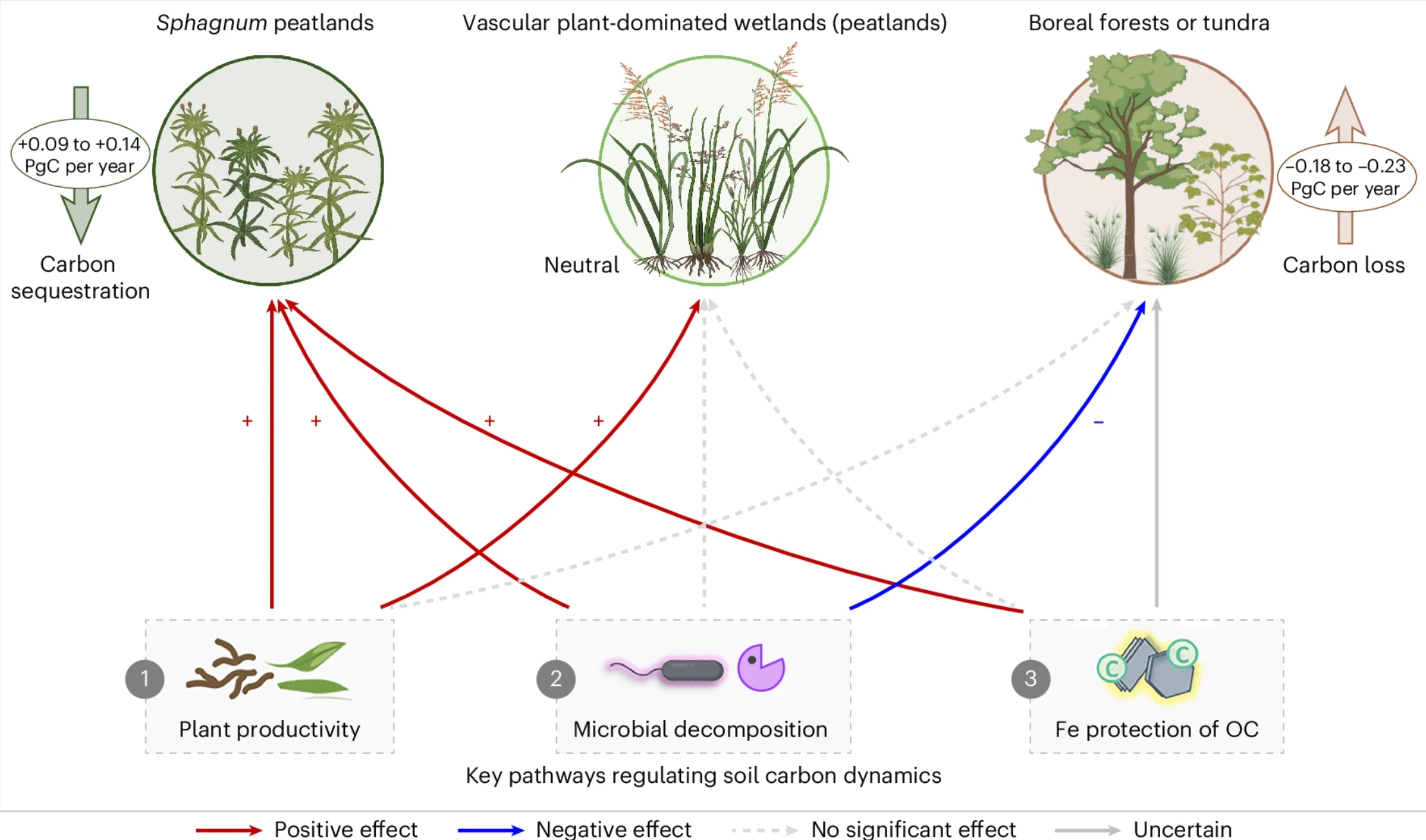 Based on these mechanisms, researchers suggested that the increase in soil carbon induced by warming in boreal Sphagnum peatlands may offset nearly half of the decline in the boreal forest carbon sink or the increase in heterotrophic respiration in Arctic tundra under warming.