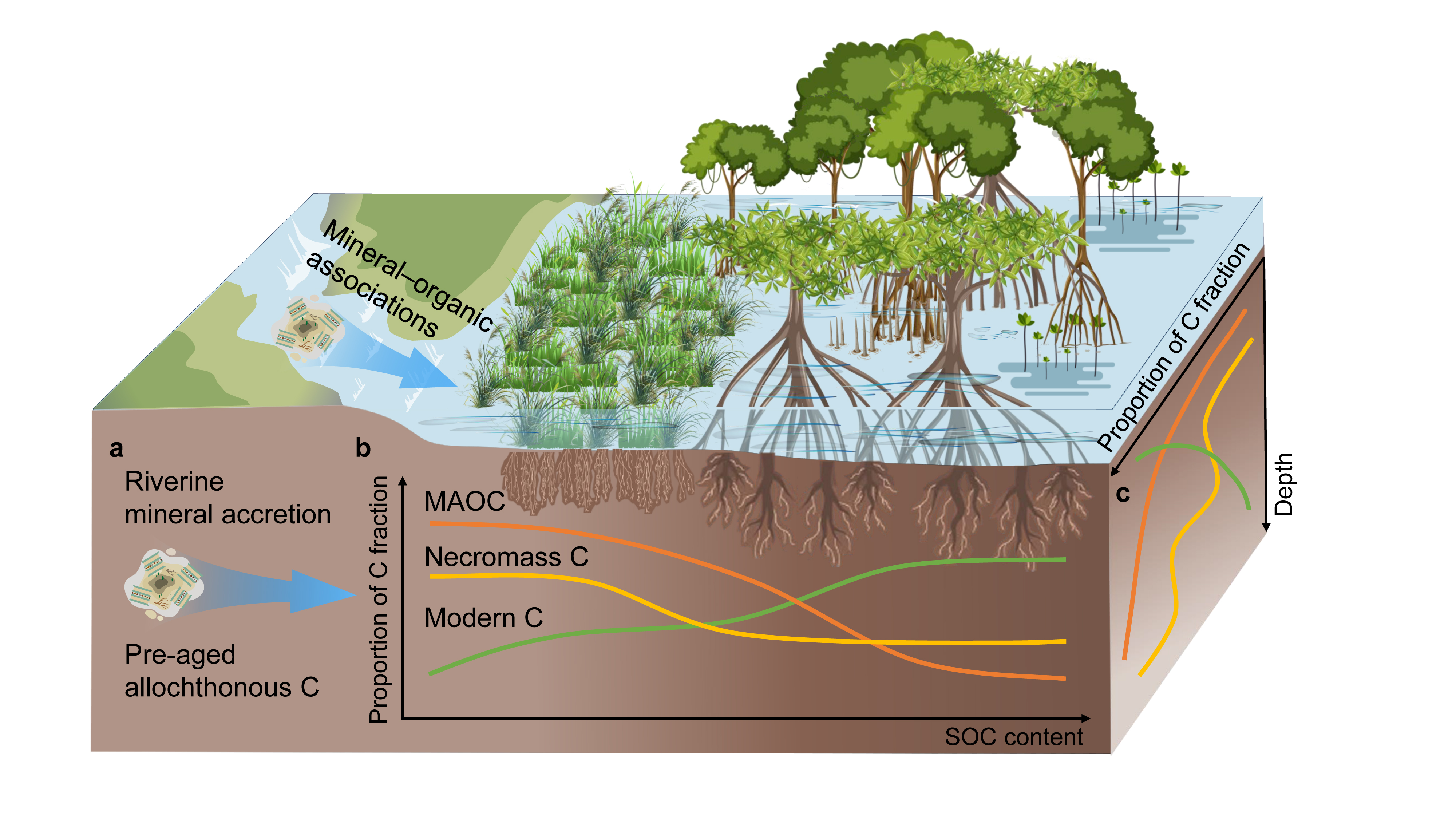 This study proposes a new blue carbon sequestration mechanism underpinned by coupled mineral–microbial regulation: microbes transform and decompose allochthonous organic matter into relatively stable compounds, which are then physically protected by reactive minerals. These results challenge the conventional view that blue carbon storage is driven mainly by the direct burial of recent plant biomass. Instead, they highlight the essential role of coupled mineral–microbial processes in sequestering pre-aged allochthonous carbon, underscoring the need to integrate this mechanism into future blue carbon accounting and ecological management frameworks.