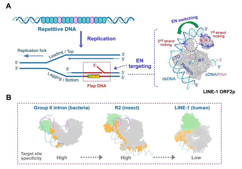 Importantly, the researchers established the first efficient in vitro DNA cleavage system for ORF2p, demonstrating that it functions as a structure-dependent endonuclease. They discovered that ORF2p exhibits high catalytic activity toward specific forked DNA substrates, particularly flap structures characteristic of the lagging strand during DNA replication. Conformational changes in the endonuclease (EN) domain enable stepwise cleavage of double-stranded DNA. This finding provides a molecular basis for the coupling between L1 integration and the cellular replication cycle.